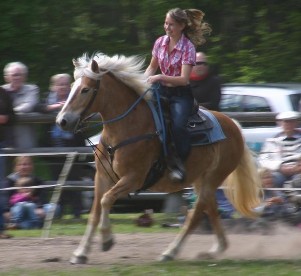 Hier reiten unsere Kinder von 10 bis 18 Jahren. Die Jugendlichen holen sich ihr "Pflegepferd" (haben sich mal zwei gefunden, wird das Pärchen nicht mehr getrennt, d.h. das Kind darf immer das selbe Pferd reiten) von der Koppel, putzen, kratzen die Hufe aus, trensen und satteln ihr Pferd. Danach geht es auf den Platz oder ins Gelände. Hier werden alle drei Grundgangarten (Schritt, Trab, Galopp) gelehrt. Unser Ziel ist es nicht turnierfähige Dressur- oder Springreiter auszubilden, sondern gute und sichere Freizeitreiter.